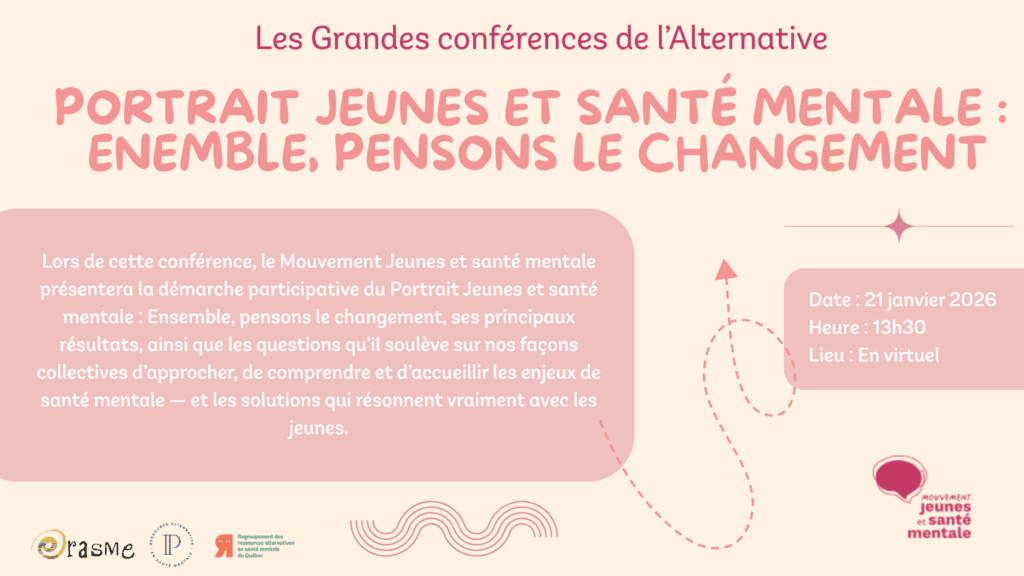Lors de cette conférence, le Mouvement Jeunes et santé mentale présentera la démarche participative du Portrait Jeunes et santé mentale : Ensemble, pensons le changement, ses principaux résultats, ainsi que les questions qu’il soulève sur nos façons collectives d’approcher, de comprendre et d’accueillir les enjeux de santé mentale — et les solutions qui résonnent vraiment avec les jeunes.