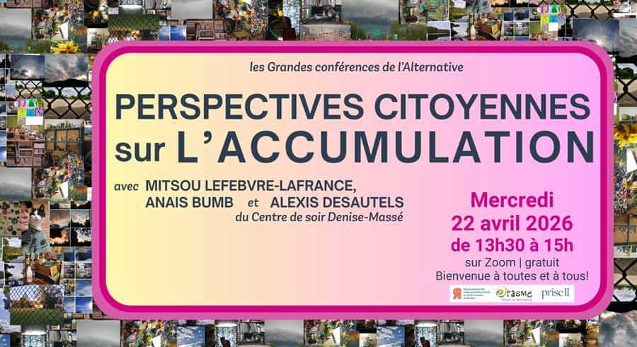 Nous vous invitons à la prochaine Grande conférence de l’Alternative « Perspectives citoyennes sur l’accumulation » qui aura lieu mercredi, le 22 avril 2026 dès 13h30.